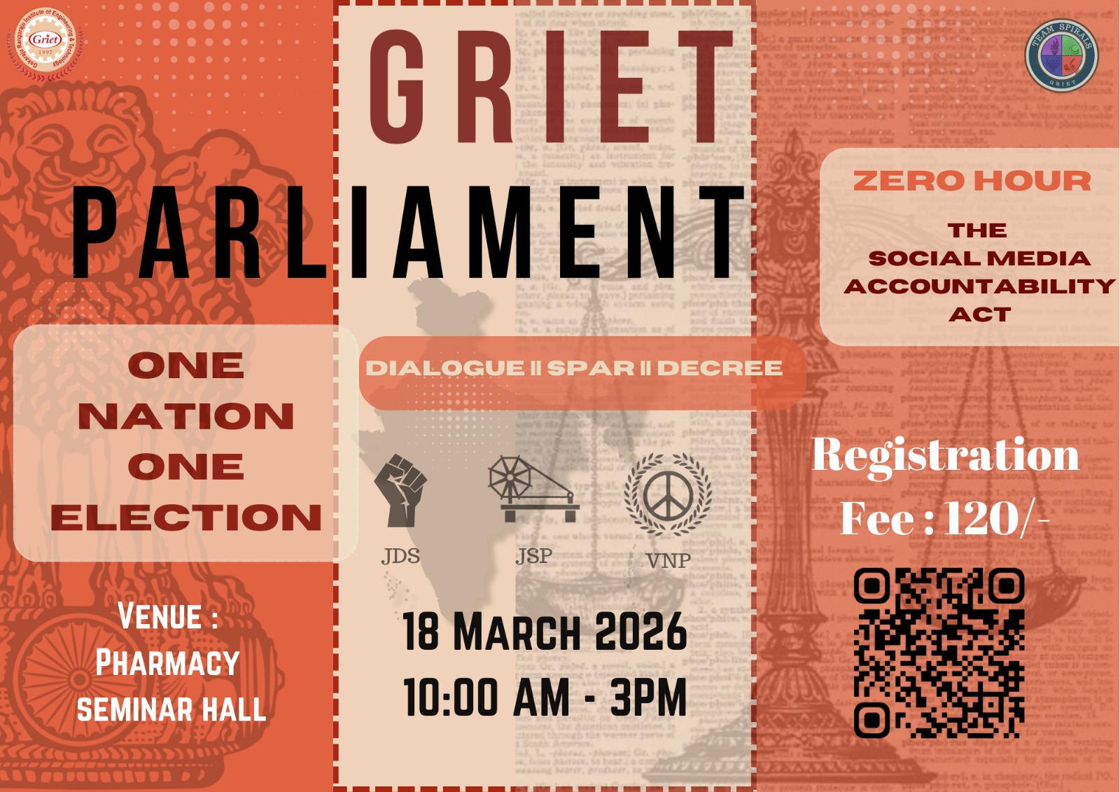Team Spirals are pleased to invite you to GRIET Parliament, a student simulation of the parliamentary system where participants debate important issues and experience the dynamics of parliamentary discussions. on 18 March 2026 from 10:00 AM-03:00 PM - Click Here