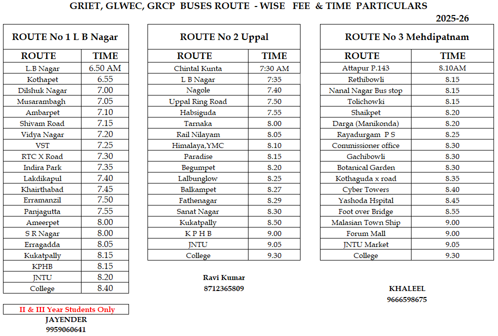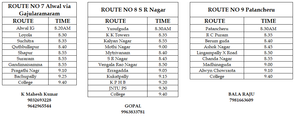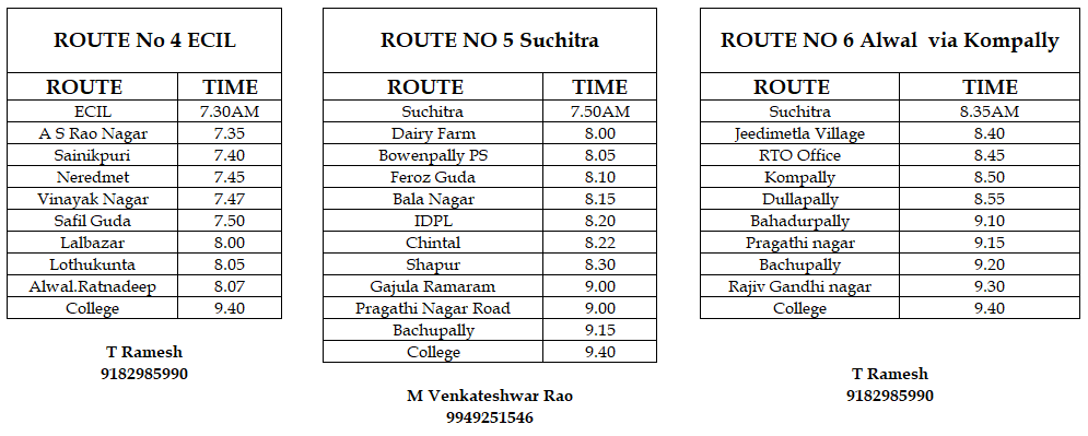 College operates 27 vehicles to provide bus facility to students from LB Nagar, Mehdipatnam, ECIL, and Patancheru.