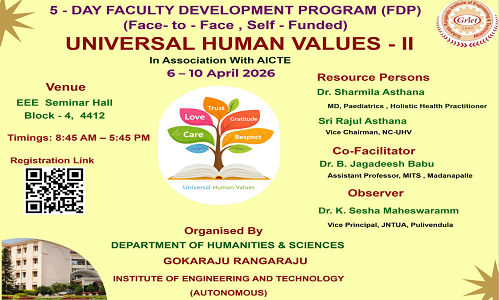 5-Day Face-to-Face, Self Funded FDP on "UNIVERSAL HUMAN VALUES-II" in association with AICTE from 6 to 10 April 2026, organised by Department of Humanities and Sciences - Click Here